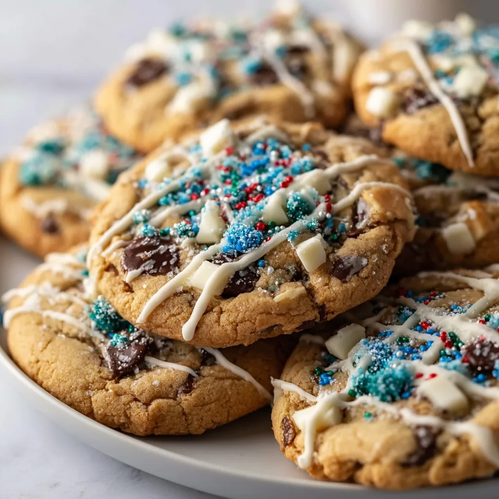 Soft, chewy chocolate chip cookies with white chocolate drizzle and shimmering blue and silver sprinkles — the perfect festive treat for winter and Christmas.
