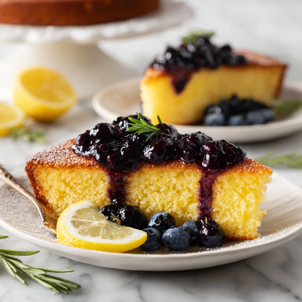 Zesty Lemon Polenta Cake with Warm Blueberry Compote: Bright citrus flavor meets rustic comfort